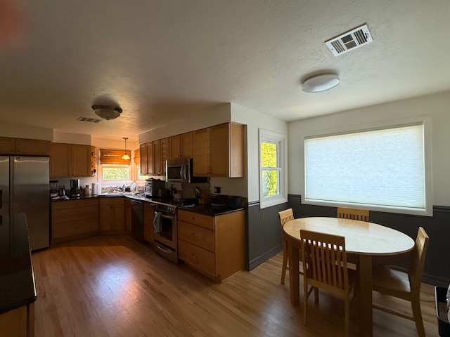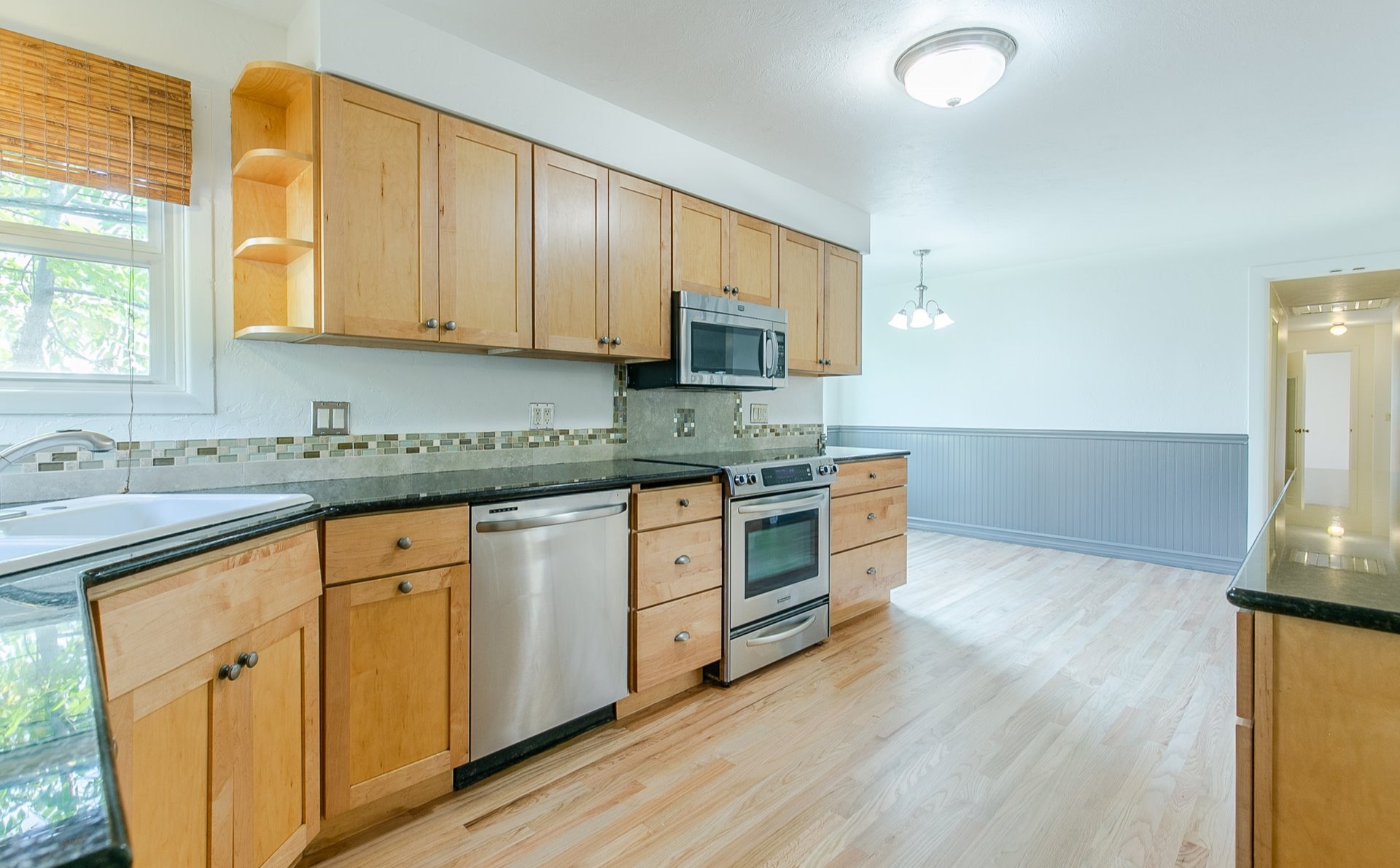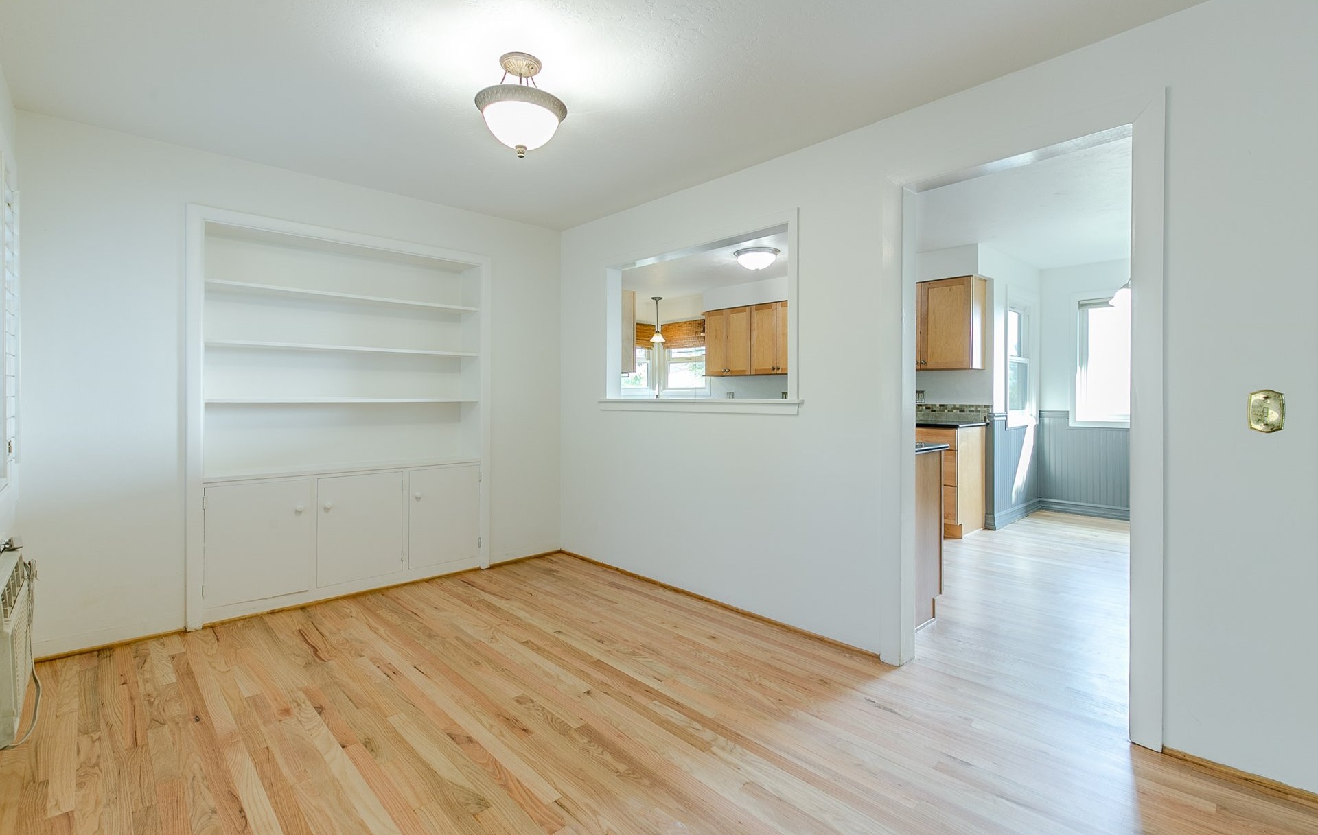 Hardwood floors throughout. Large kitchen, ample counterspace, and great storage. Kitchen opens to formal dining area